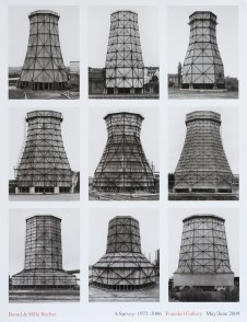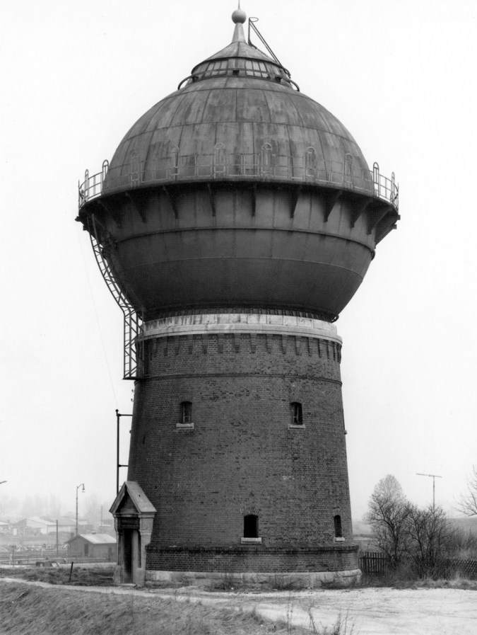 The husband and wife team of Bernd and Hilla Becher began photographing together in 1959. For close to fifty years, they documented architectural forms they collectively referred to as “anonymous sculpture.” Their extensive series of water towers, blast furnaces, coal mine tipples, framework houses of mine workers, and other vernacular industrial architecture—often technologies on the verge of obsolescence—comprise an in-depth study of the intricate relationship between form and function. The Bechers produced impeccable black and white photographs, using a large-format camera carefully positioned under overcast skies to record shadowless front and side elevation views of their subjects. Arranging these matched photographs in a grid, the Bechers produced what they called “typologies,” which grouped buildings by function, underscoring the similarities and differences between structures.