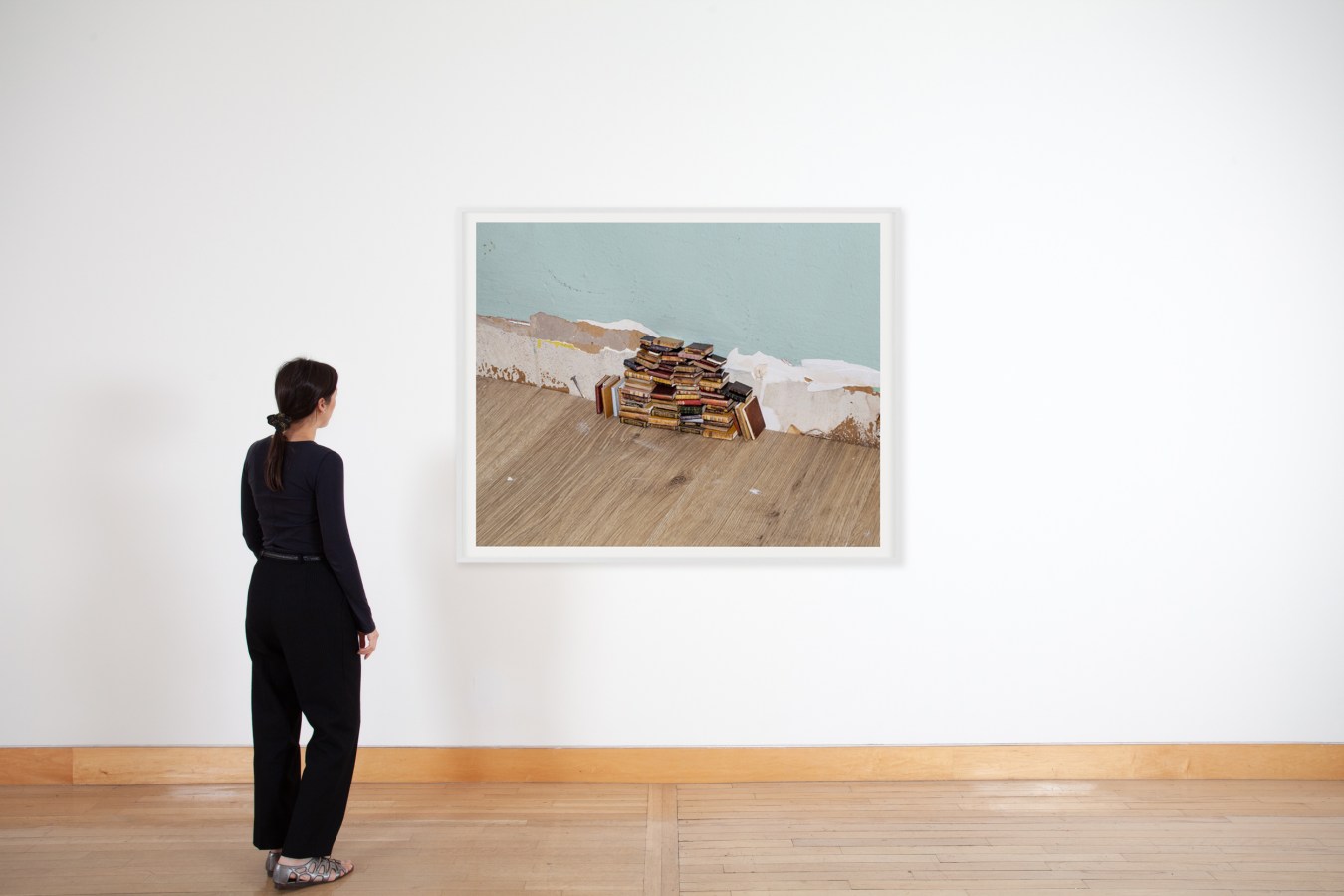 Soth pairs a photograph of miniature books with a note that might allude to their content. The playful sense of scale surprises unsuspecting viewers and suggests the curious objects that fill the halls of art schools.