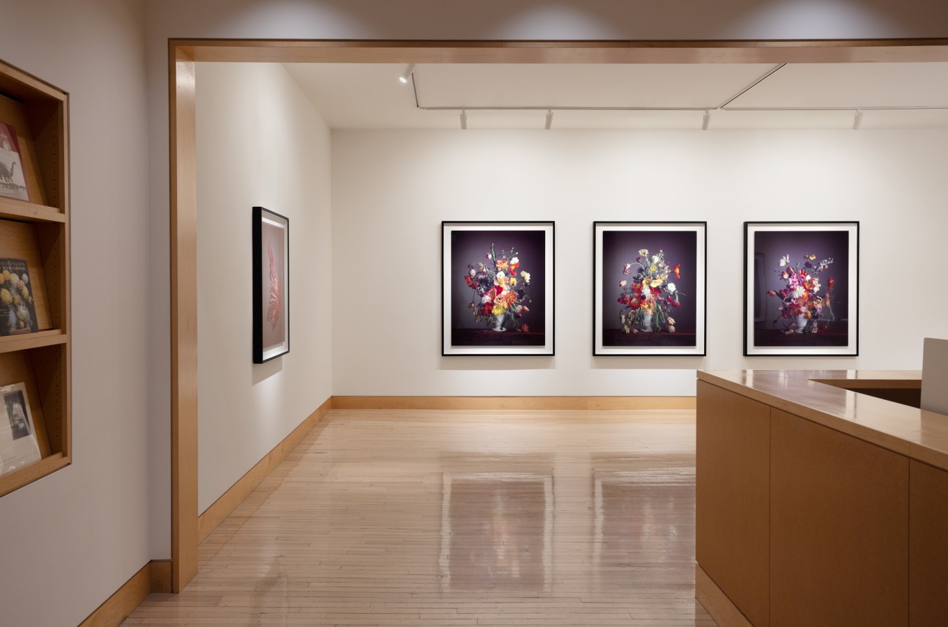 The exhibition also features work made in Learoyd’s London studio. Still lifes depict red, pink, and white poppies with vibrant or fading petals, and other natural elements. Often drawing on themes from Dutch Golden Age painting, the photographs capture the subtle sheen and iridescence of feathers or flowers, a focus on optical qualities also found in memento mori paintings. Precisely transcribing the various ways that light falls onto natural materials, Learoyd’s photographs emphasize the ambiguity between dead and living things and often refer back to the act of seeing. Some works include vintage glass eyeballs hidden among the stems of poppies, creating the unsettling suggestion that the viewer is in turn being watched.