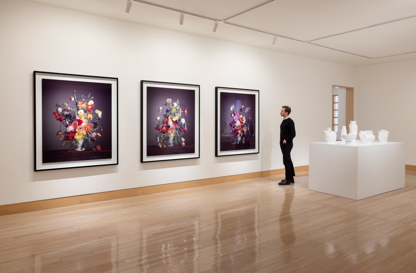 For works made in collaboration with Frances Palmer, Learoyd photographed lavish arrangements of tulips and other flowers housed in the ceramic vessel Palmer created from his sketches. In Learoyd’s photographs, flowers seem to erupt and tumble out of the white base. “Based on [Learoyd’s] measurements, I made the pieces in both a translucent bisque porcelain and low-fire earthenware with a matte white glaze so that he could choose which texture would work best for the photograph,” Palmer writes. These vessels will be on view along with the photographs and a selection of other ceramics made by Palmer for the show. “Continuing with these ideas, I have made additional pieces in both clay bodies, thinking about how my pots will have a conversation with Richard’s work in the gallery.”