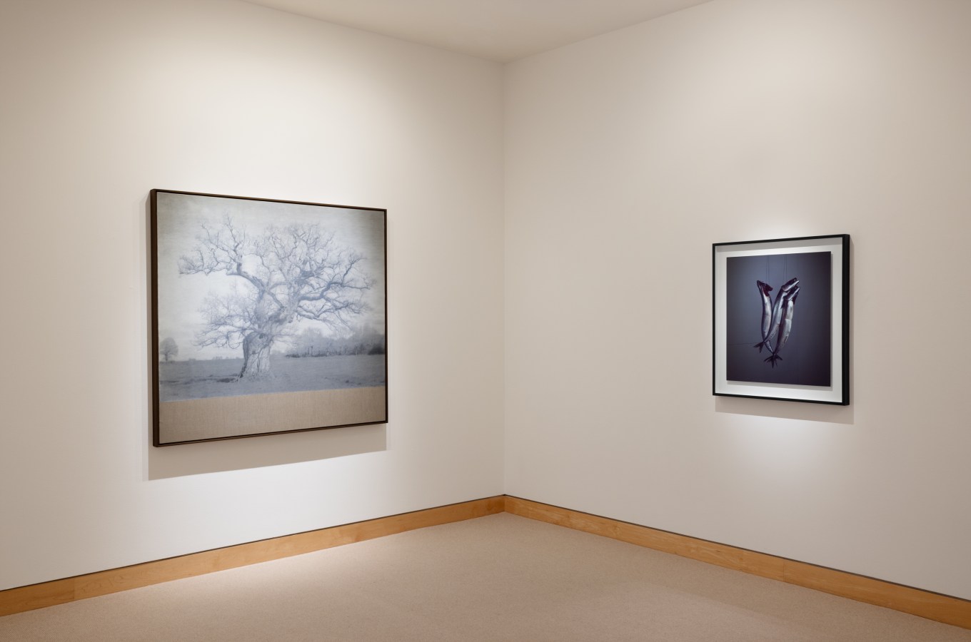 At the center of the exhibition are three monumental landscapes set in the English countryside, each depicting a massive, bare-branched tree. On view for the first time, the works are made using a process combining multiple layers of pigment printed onto hand-gessoed canvas. In each, a section of canvas is left raw, highlighting the differences in texture between materials and complicating the relationship between surface and photographic image. In part, the images draw inspiration from the work of 19th-century artists William Henry Fox Talbot, inventor of the salted paper and calotype processes, and English Romantic landscape painter John Constable, whose pencil sketches of willow trees have been a longtime interest of Learoyd’s.