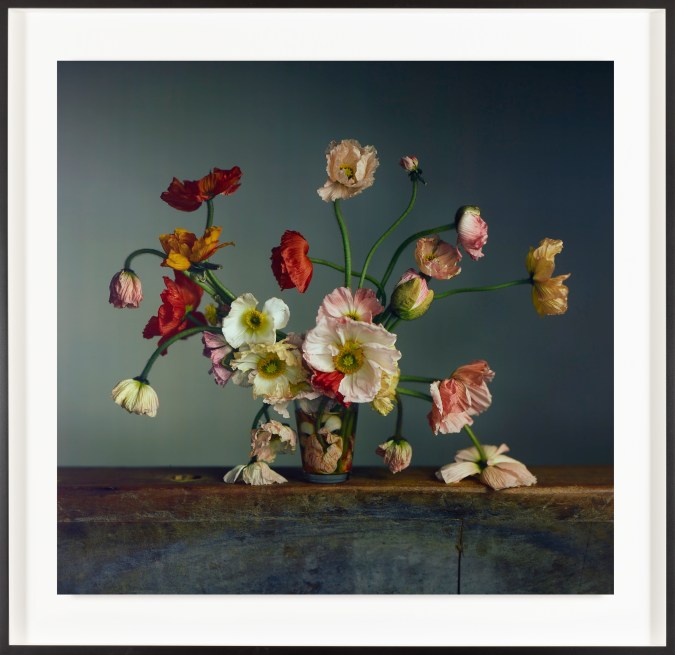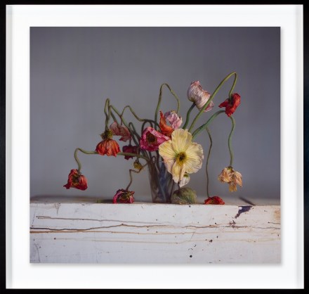 Richard Learoyd’s color images are made with one of the most antiquarian of photographic processes: the camera obscura. Literally translated from Latin as “dark room,” Learoyd has created a room-sized camera in which the photographic paper is exposed. The subject—often a person, sometimes a still life—is in the adjacent room, separated by a lens. Light falling on the subject is directly focused onto the photographic paper without an interposing film negative. The result is an entirely grainless image. The overall sense of these larger-than-life images redefines the photographic illusion. Learoyd’s subjects, composed simply and directly, are described with the thinnest plane of focus, re-creating and exaggerating the way that the human eye perceives, and not without a small acknowledgement to Dutch Master painting.