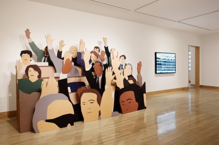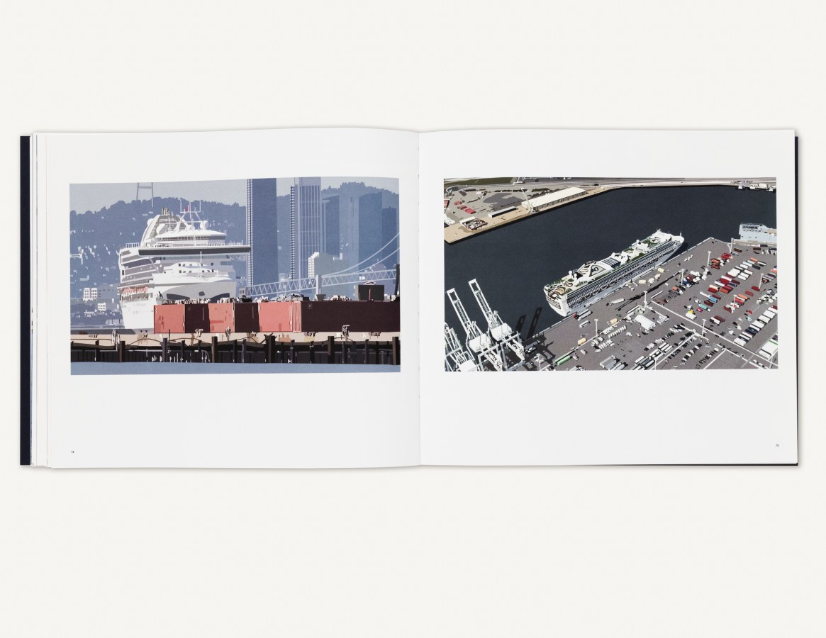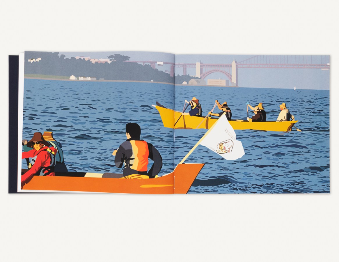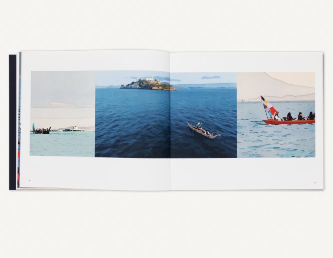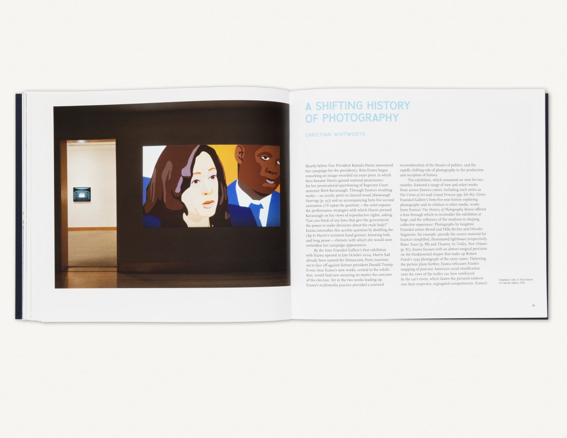The fully illustrated catalogue features contributions from Dodie Bellamy, Rudolf Frieling, and Julian Brave NoiseCat, with an introduction by Frank Smigiel and an essay by Fraenkel Gallery Director Christian Whitworth. Highlighted works include Ezawa’s Grand Princess (2024), in which the artist reframes the COVID-wracked ship’s progress to the Port of Oakland; Alcatraz Is an Idea (2024), a collaboration with Brave NoiseCat highlighting scenes from the 2019 Indigenous Peoples’ Day Alcatraz Canoe Journey; Merzbau 1, 2, 3, a remaking of three photographs documenting German artist Kurt Schwitters’s home studio installation known as the Merzbau (1923-37); and others.