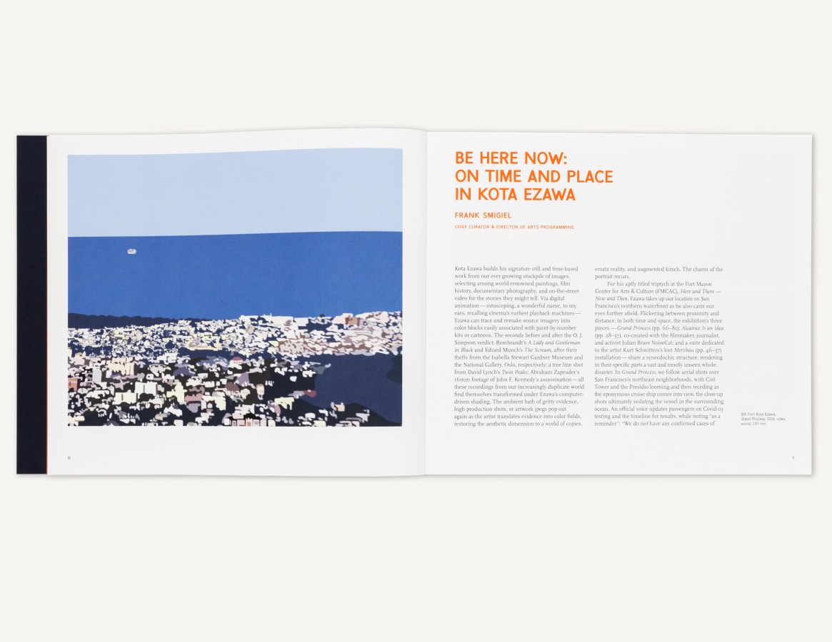 A publication to accompany the 2025 exhibition Kota Ezawa: Here and There — Now and Then, presented by Fort Mason Center for Arts & Culture in collaboration with the San Francisco Museum of Modern Art. Taking a deep dive into San Francisco’s collective memory, the exhibition transformed recent Bay Area history into immersive art. Featuring two major video works and a captivating installation with photographic evidence of a legendary but lost art environment, the show highlighted Ezawa’s ability to blend historical events with contemporary art practices.